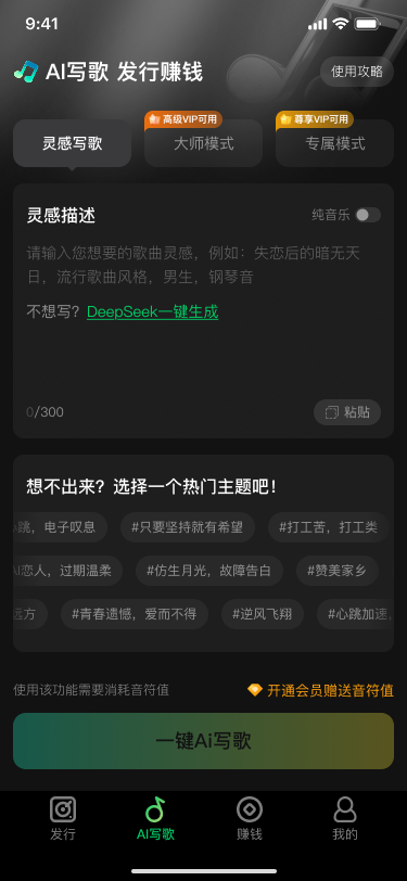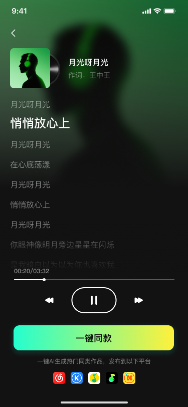 随时随地开启音乐创作之旅,AI 金曲大师 APP 让每个人都能成为金曲制造机!无论是通勤路上迸发灵感,还是深夜突然有了创作冲动,打开 APP,一键开启你的音乐创作。 基于前沿深度学习的多模态 AI 模型,AI 金曲大师 APP 实现词曲生成、智能编曲、人声合成一站式创作。输入关键词或哼出旋律片段,3 分钟内即可生成包含主旋律、和声、歌词的完整曲目。「情绪 - 风格」双维度算法,精准匹配伤感抒情、电子舞曲等数十种音乐流派,满足不同创作需求。APP 还支持录制 10 秒人声样本,快速生成专属 AI 歌姬,让你的声音化身百变歌手,轻松驾驭多元曲风。 APP 内置的文学性评估模型,能实时检测歌词押韵度、意象连贯性,提供「诗意增强」「口语化调整」等优化建议。智能混音功能搭载百万级音源库与智能均衡器,支持多轨道编辑、BPM 调节,即使在手机上也能输出 CD 级品质作品。无论你是音乐小白,还是专业创作者,AI 金曲大师 APP 都能帮你将灵感转化为爆款金曲。